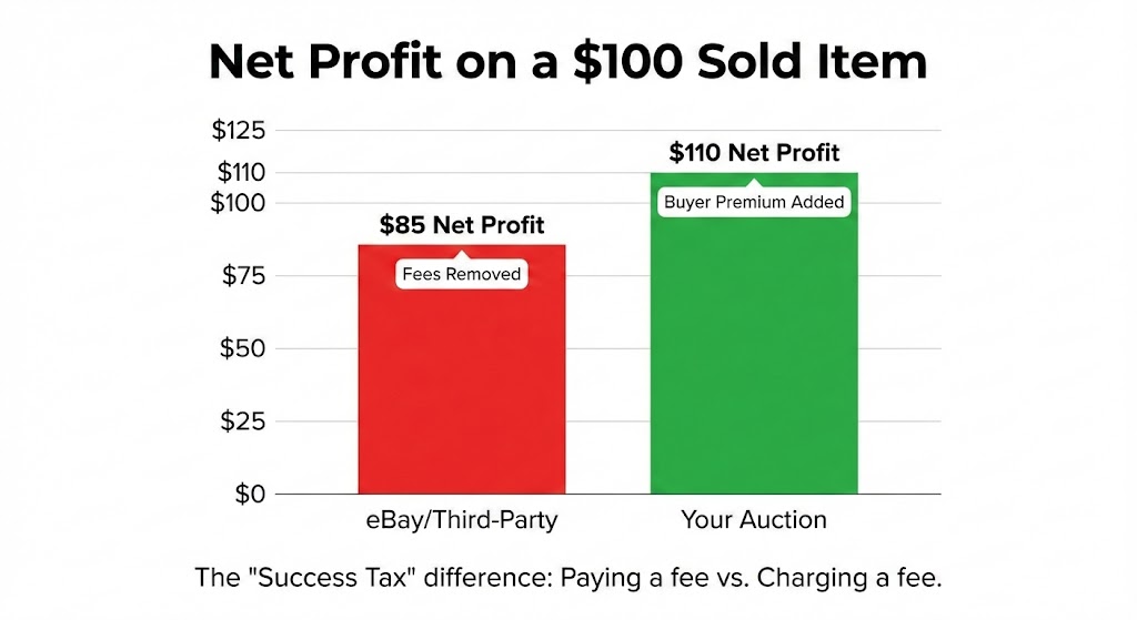 The Owned Auction Way: You sell that same item for $100. But here is the secret: In the auction world, it is standard to charge a Buyer’s Premium (often 10% or more). That means the buyer pays $110. You keep the $100 sale price PLUS the $10 fee.